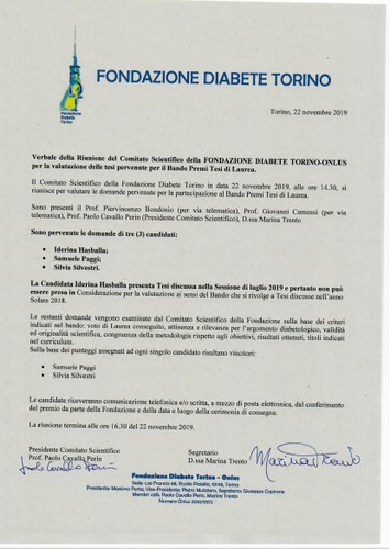 La FONDAZIONE DIABETE TORINO - ONLUS, organizzazione non lucrativa di utilità sociale, (ai sensi e per gli effetti del D. Lgs. 4 dicembre 1997 n. 460) con sede legale in Torino, presso Studio Patella, Corso Francia 68 - 10143 Torino, che ha come obiettivo di sostenere e promuovere attività di ricerca scientifica Risultati: Il Comitato Scientifico della Fondazione Diabete Torino, dopo aver valutato le tesi pervenute e sulla base dei criteri del Bando Premi Tesi di Laurea, comunica che risultano vincitori
